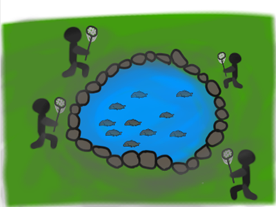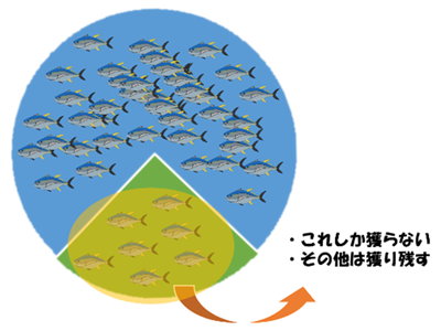 例えば学校や公園の池の中のコイをクラスのみんなで獲ったらあっという間に池にはコイがいなくなってしまうよね。実は海の中の魚たちにも限りがあって、同じようにたくさんの漁師さんたちが同じ種類の魚を獲りすぎてしまったら、海の中からその魚がいなくなってしまうんだ。