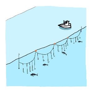 縦に長さ500mほどの縄を沈め、針と餌や疑似餌を付けた糸を数本つけて、メカジキやメバチ、ソデイカなどを釣る漁業