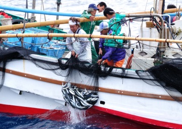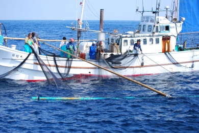 八丈島では夏から冬にかけてムロアジの漁業が行われています。漁船に6人~7人が乗り込み、魚を餌で集め竹の棒で広げた大きな網でムロアジを群れごと獲ります。このときに、ムロアジと一緒にトミメ(ナメモンガラ)という別の魚が一緒に混ざって網に入ってくることもあります。